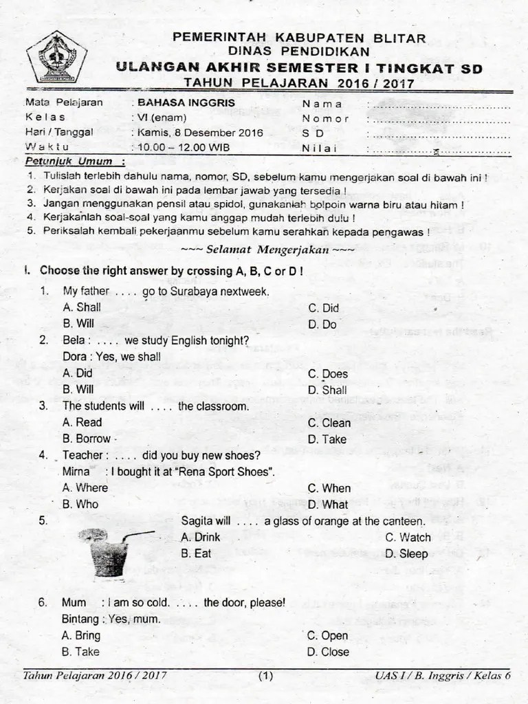 Ċ, soal uas semester 1 kelas 6 mapel bahasa indonesia.pdf. Soal untuk nomor 6 dan 7. Ċ, soal uas semester 1 kelas 6 . Berdasarkan hasil kunjungan kami di lokasi, ternyata kegagalan panen para petani tahun ini disebabkan oleh serangan hama tikus dan wereng. Saat berpisah dengan teman kita mengucapkan. Demikianlah soal uas / pas bahasa indonesia kelas 7 (vii) jenjang smp/mts semester 1/ ganjil kurikulum 2013 yang dapat kami bagikan, . (7) berdasarkan hasil penelitian pada 17 provinsi di indonesia, sebanyak 2,6 persen siswa sltp dan 4,7 . Latihan soal uas bahasa indonesia. Penyajian karangan yang panjang dalam bentuk singkat disebut. Berilah tanda silang (x) pada jawaban yang benar! 1, 20 nov 2015 17.19, kurnia septa. Soal uas bahasa indonesia kelas 1 sd semester 1 (ganjil). Soal uts bahasa indonesia kelas 6 sd semester 1 tahun 2016/2017.